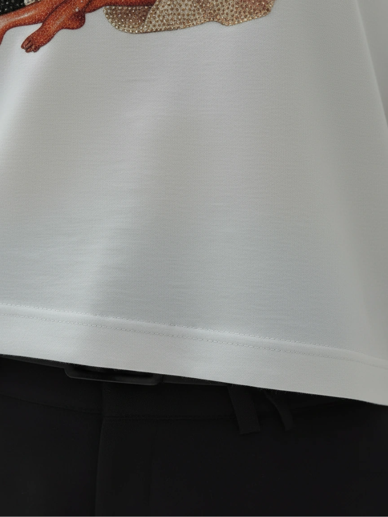 Romantic and striking, this piece captures a sitting bear and a graceful woman holding a rose bouquet, both embellished with shimmering rhinestones. A statement T-shirt that combines creative design with meticulous sewing and attention to every detail.