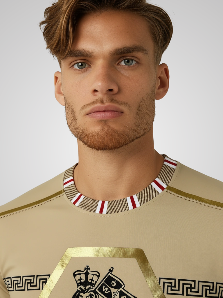 Features a central lion framed by a thick golden foil hexagon, complemented by linear golden foil accents on the shoulders. The sleeve cuffs and neckline incorporate a custom fabric with a geometric pattern, adding distinction and visual contrast.