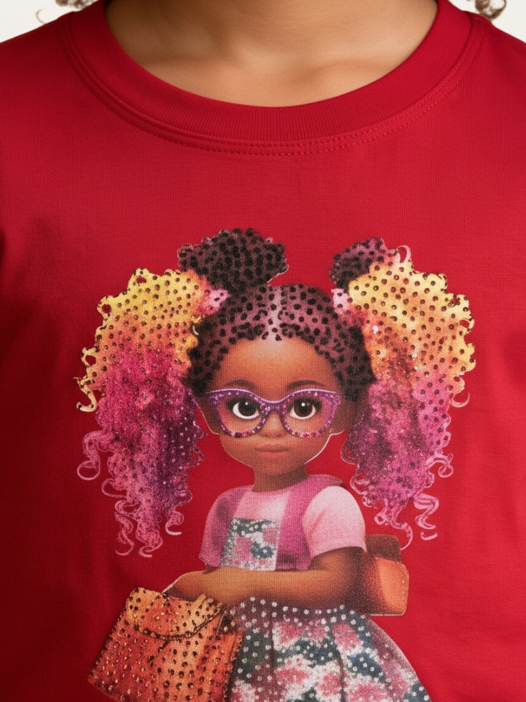 T-shirt featuring a colorful print of a teen girl with a backpack, handbag, and rainbow-toned hair. Rhinestone details add dimension to the design. Finished with precise stitching and a soft touch that makes it easy to wear.