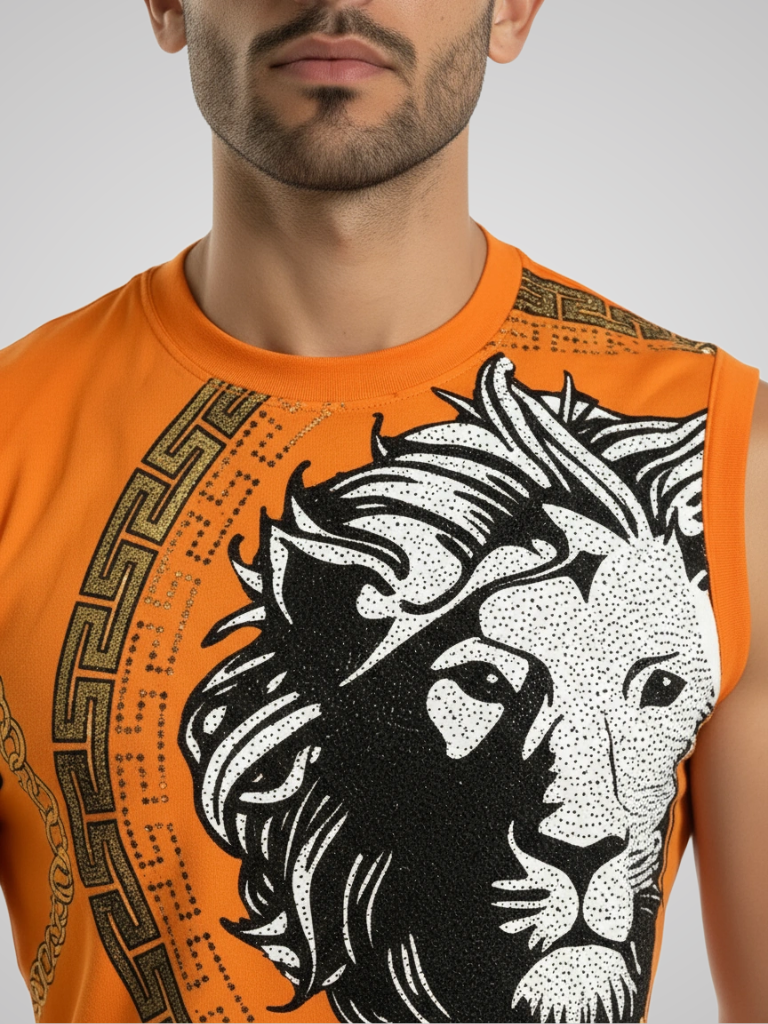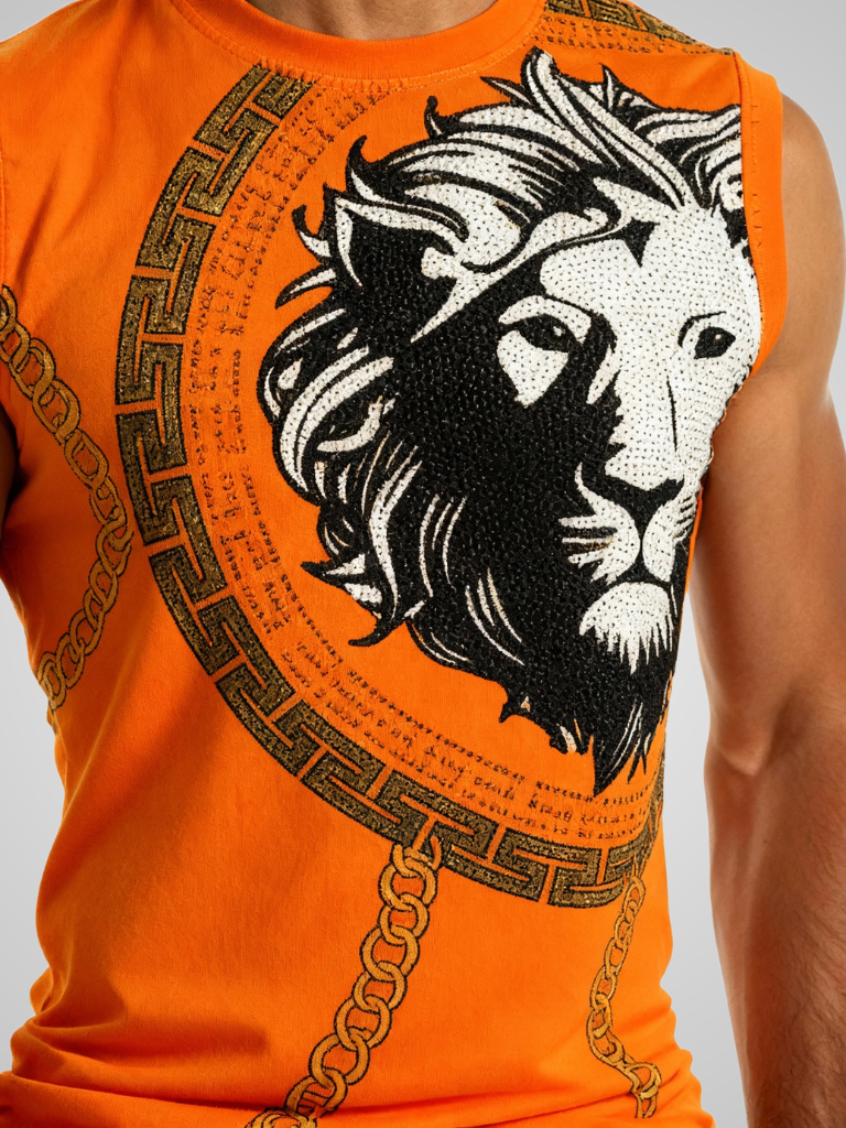 Tank top in a deep tone featuring chain prints in golden foil and a double semicircular pattern in thick and thin foil. At the center, a white lion face adorned with crystalline rhinestones adds dimension and controlled shine. Uniform-tone stitching completes a neat finish with high visual definition.